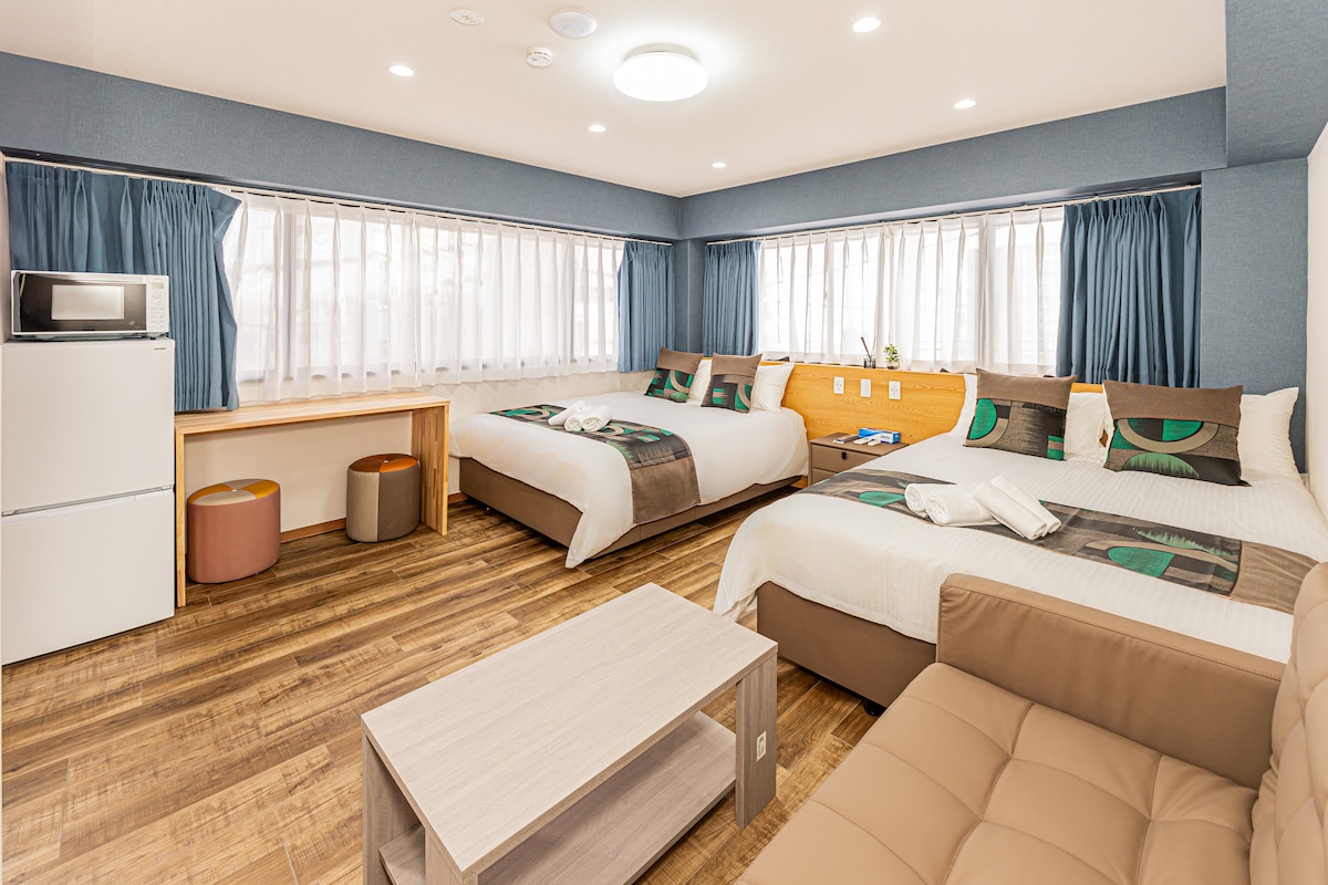 Enjoy a spacious Japanese-modern room with a cozy beds, tatami area, large dining table, kitchen. The room has 2 washbasins, 2 private showers, and 2 toilets, offering great comfort for groups. Located right in front of Tokyo Skytree, just 2 minutes to Solamachi and walking distance to Asakusa, it’s the ideal base for sightseeing. The area has supermarkets, convenience stores, and many restaurants. We have 9 identical rooms available. Experience your best Tokyo stay with us!