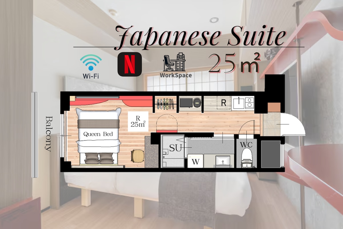 秋葉原、御徒町步行可達,這間以「禪」為主題的25㎡高雅客房,讓您暫忘城市的喧囂。木質溫潤與墨黑靜謐交織的和風摩登設計,營造出洗練而沉靜的氛圍。有限空間經精心規劃,配置一張大床與專屬工作區。高速Wi-Fi與打印機,滿足商務與長住需求。廚房配備BALMUDA熱水壺、電飯煲等設備,日常起居便利無虞。設有淋浴間、獨立廁所、洗面台與洗衣機,水區潔淨舒適。另提供嬰兒用品租借,適合家庭入住。無論觀光或出差,這裡都是兼具靜謐與功能美的理想據點。