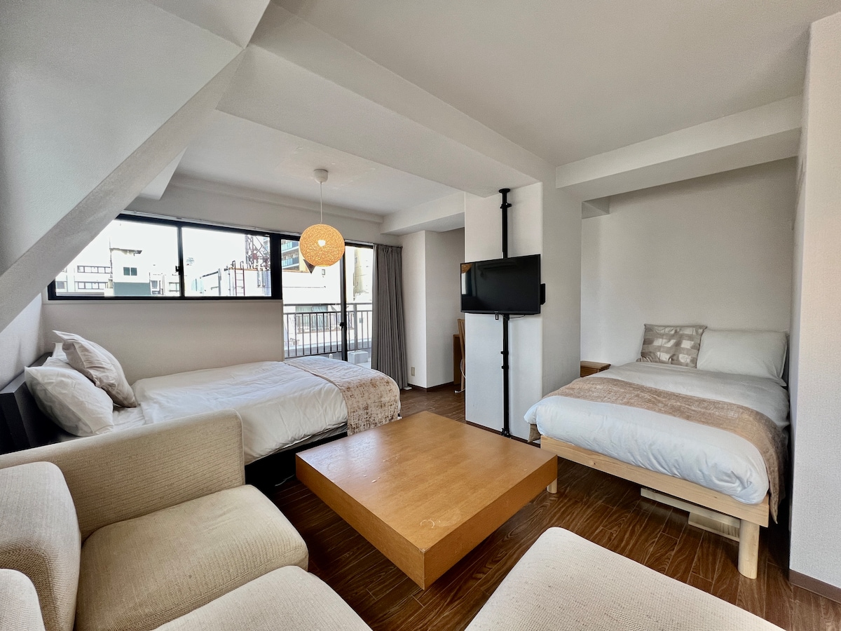 A stylish, modern condo-style hotel opened in May 2025, located in the heart of Akihabara. Just a few minutes’ walk from both Suehirocho and Akihabara stations, with convenience stores and restaurants nearby. Surrounded by figure shops, electronics stores, maid cafés, and real-life Mario Kart rides—plus custom car gatherings on weekends. Still, the street is quiet at night for a restful sleep. 25㎡ studio Single-size bunk bed Smart TV Fully equipped kitchen In-room washer-dryer