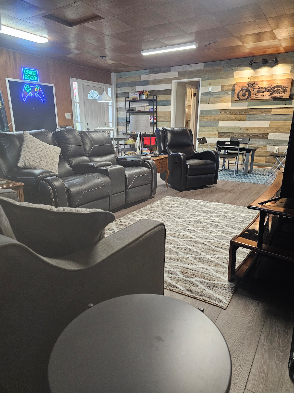 Recently renovated, this cozy 2-story colonial offers a full kitchen with gas range, espresso machine, air fryer, dishwasher, and wine fridge. The kitchen side door opens to a fenced-in backyard. The living room has a sofa, large SmartTV and a dining area with seating for 4. The main level bedroom has a twin trundle bed and vanity. Upstairs is a large loft-style bedroom with king-size bed, faux fireplace, work desk, closet and sturdy oak storage furniture. Washer/dryer available in basement.