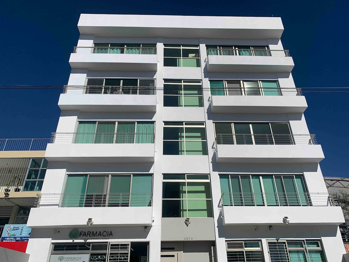 Luxurious apt. with modern decoration and comfortable spaces (117 sqm). This new building has a gym, pool, and security 24/7. Lots of restaurants, cafes and bars nearby. It has a centrical location inside the Financial District (Providencia), 5 minutes away from Punto Sao Paulo (nightlife and restaurants), 7 min. away from Andares, and 20 min. away from Downtown. This place is ideal for business trips, groups and families. It is a secure building with controled access in a safe zone.