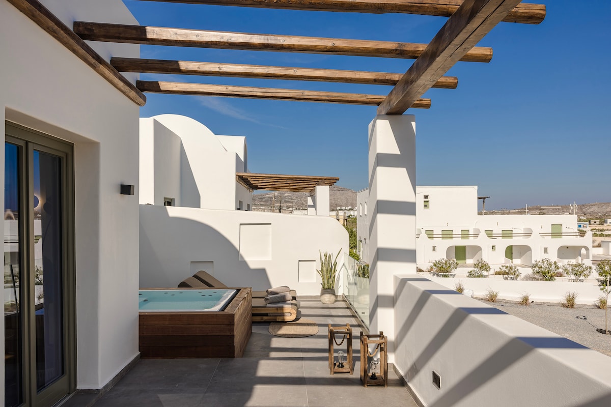This elegant suite is perched on the cliffs of the caldera in Oia. It combines traditional Cycladic architecture with a minimal decorative style, making it the perfect choice for those who want to relax. The suite is aprox 37 sm, features a private outdoor cave hot tub, offering privacy along with stunning views of the caldera and volcano. Breakfast is included in the price. The room is equipped with air conditioning, free Wi-Fi, coffee and tea-making facilities, bath amenities, and a smart TV.