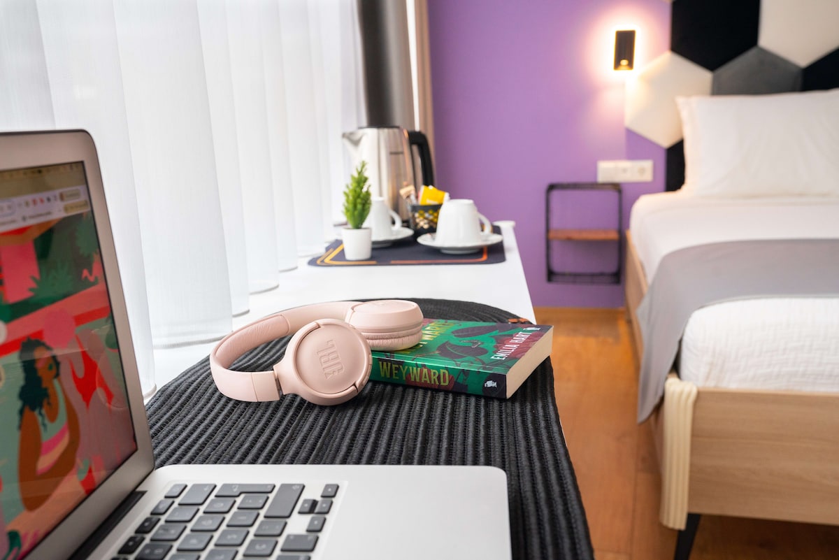 Konum çok merkezi,heryere yürüme mesafesinde,günlük temizlik hizmeti,elektrik,su,internet ücretsiz.Wifi hızlı.Otelin Havuzlu bahçesinde çalışabilme imkanı.Kahve dükkanından otel müşterilerine özel indirim ile yararlanma imkanı.Ücretsiz otopark.