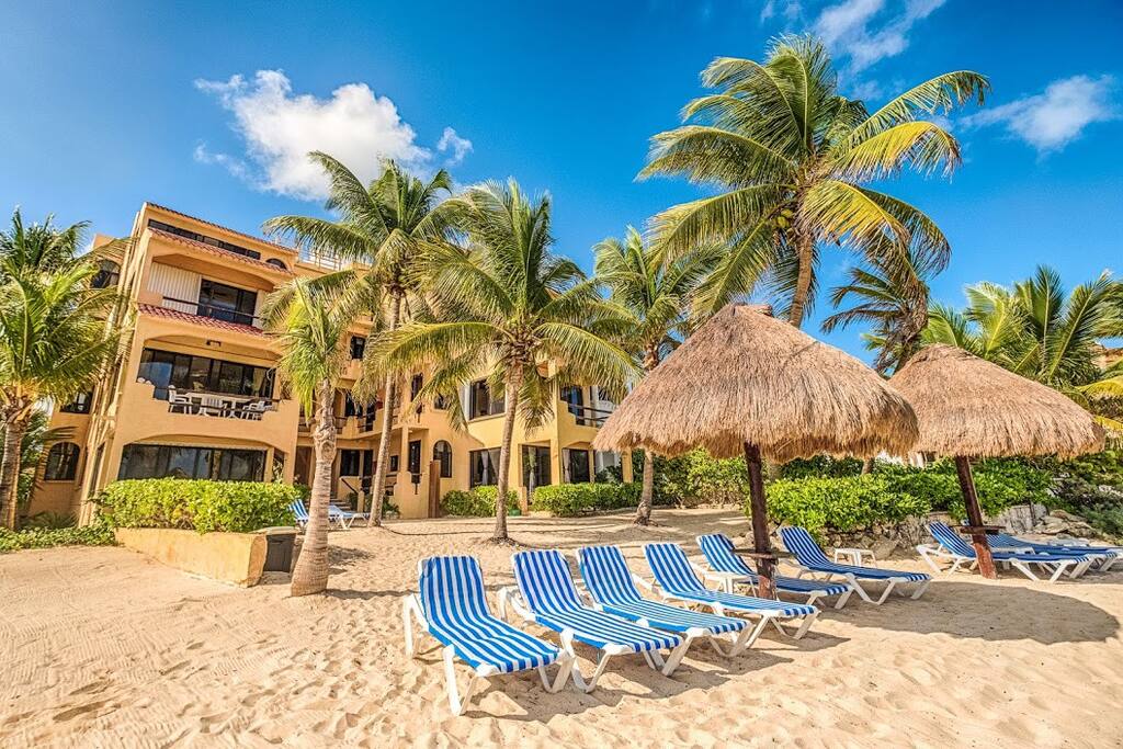 RIGHT ON THE BEACH! We will treat you right and you will have a blast. Please enjoy our spacious, beautiful ground floor 2 bedroom condo right on Half Moon Bay with incredible ocean views with floor to ceiling front windows that provide a full view of Halfmoon Bay, and snorkeling right out your back door! You can also snorkel at Yal-Ku Lagoon which is a 5-minute walk or Akumal Bay one mile down the road to swim with sea turtles!