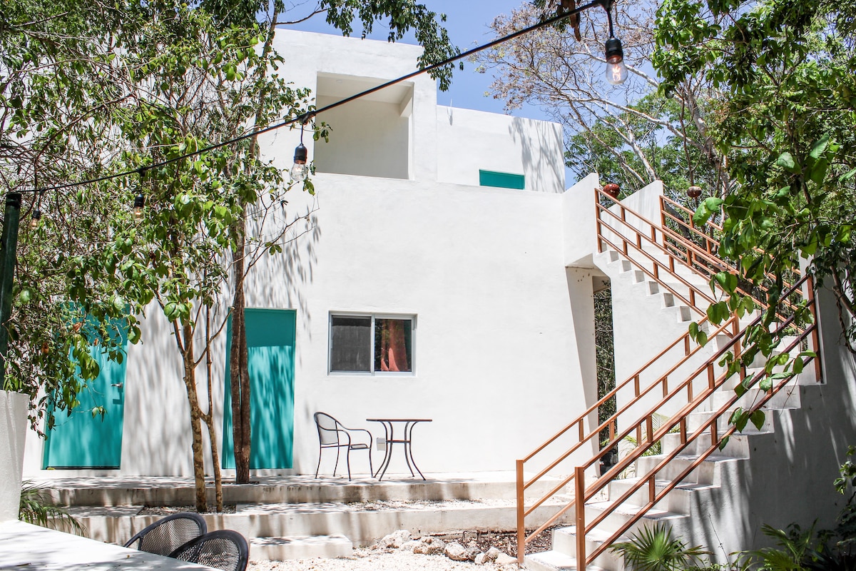 Our home ARKAH, is a one acre jungle oasis with five 2bed/2bath and five 1bed/1bath distancing friendly, 20 minutes from playa del carmen and 20 min from Tulum and only 5 minutes from the spectacular Akumal Beach. Enjoy the cenote shape pool, BBQ grill, sun beds, free parking, strong A/C, fiber optic WiFi (50 Mb/s), fully equipped kitchen. Located on the 2nd floor with lots of natural light and 1 big private terrace.
