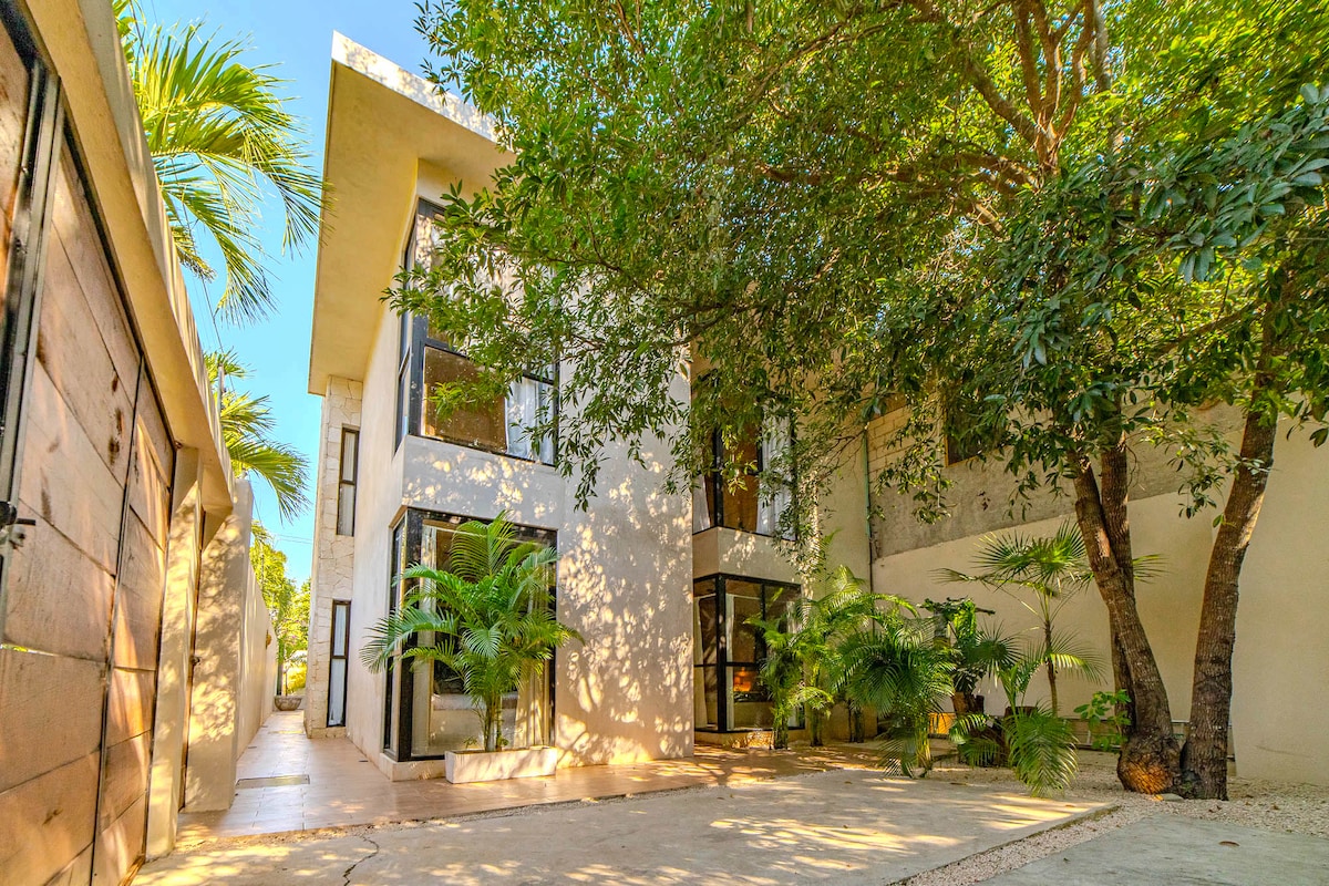 Our home ARKAH, is a one acre jungle oasis with five 2bed/2bath and five 1bed/1bath distancing friendly, 20 minutes from playa del carmen and 20 min from Tulum and only 5 minutes from the spectacular Akumal Beach. Enjoy the cenote shape pool, BBQ grill, sun beds, free parking, strong A/C, fiber optic WiFi (50 Mb/s), fully equipped kitchen. Located on the 2nd floor with lots of natural light and 1 big private terrace.