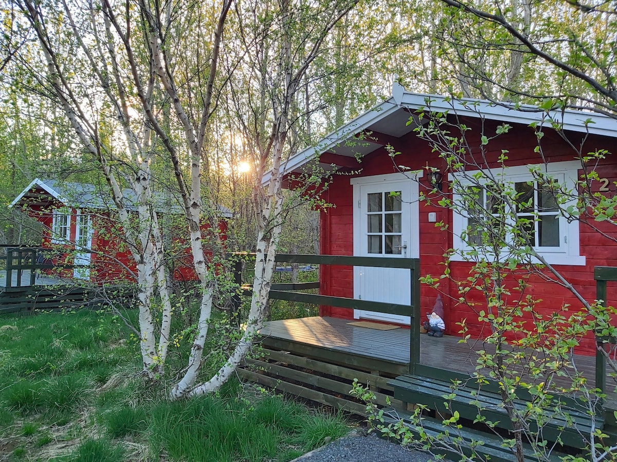 Registered number:- HG-00020047. The cabin is 15 m2 and is a hidden nugget in our garden overlooking the fjord opposite Akureyri. The cabin was completed in April 2020. There is a kitchenette with a kettle, microwave and fridge. The WC is separate inside with a hand basin. The cabin is private and there is a half wrap around deck to enjoy the evening views and midnight skies. There is an outside shower with hot water for a natural experience. All products in the cabin are fragrance-free.