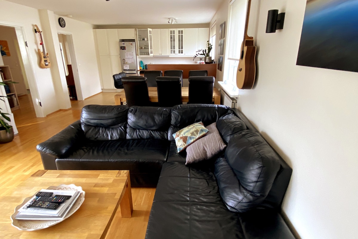 A great apartment (Penthouse) right in the center of Akureyri. The apartment in 95 sq.m. (1020 sq.ft.) and can accommodate up to 8 people in 2 bedrooms and in 2 sofa beds in the living room. The apartment is right by the beautiful harbor of Akureyri. All main restaurants, bars and cafe's in Akureyri are within a walking distance from the apartment. Museums and galleries are also close by and the famous Akureyri swimming pool is a mere 500 meter walk from the apartment.