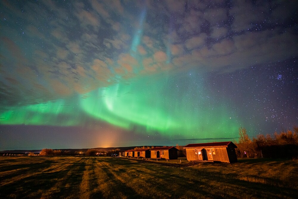 This is a private, cozy cabin that suits two adults. It is possible to add and extra bed for one child. The cabin is furnished with two twin beds, a table and chairs. There is a coffemachine, kettle and a small fridge. Bathroom with shower. This is part of our family run guesthouse. Located 5 km north of Akureyri on the countryside with a beautiful view overlooking Eyjafjörður.