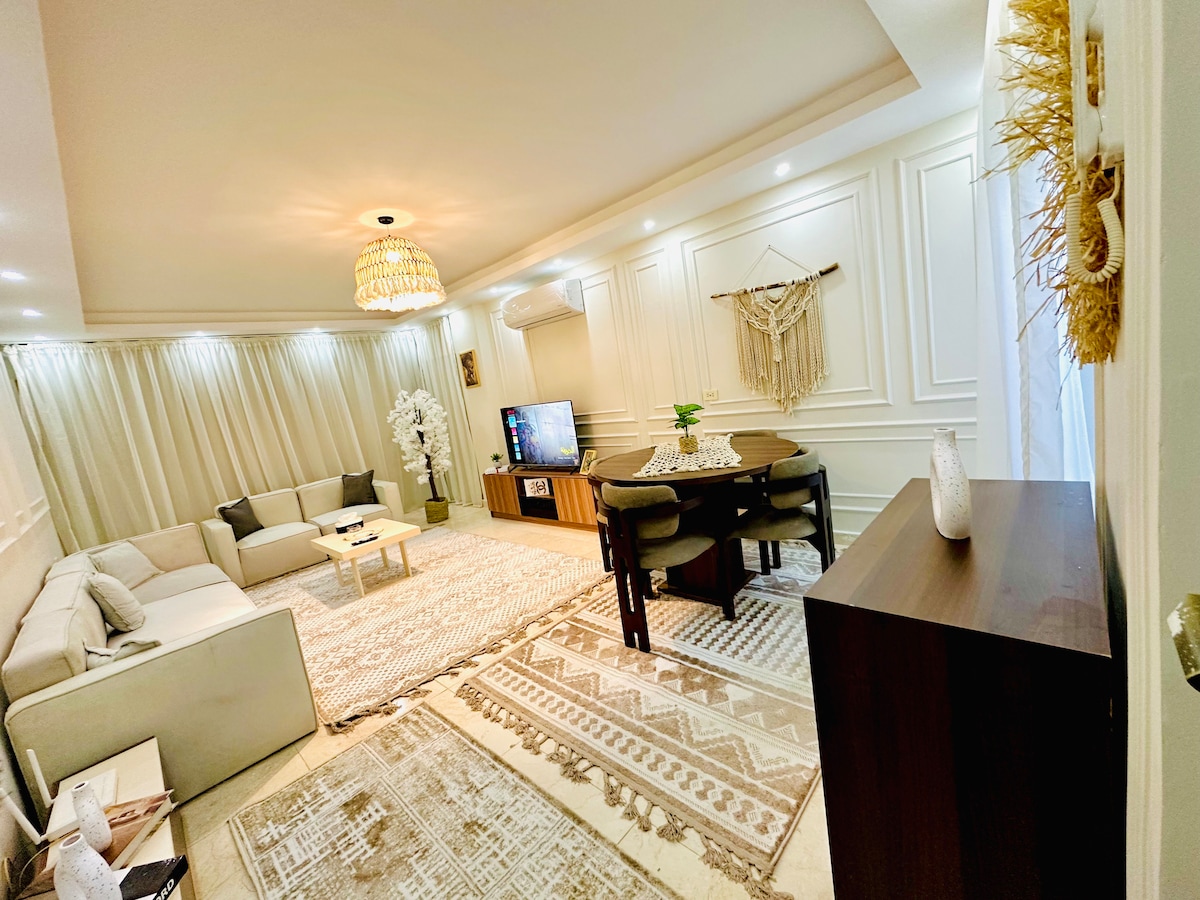 This elegant boho-style apartment offers two bedrooms, a cozy living room, a modern bathroom, and a fully equipped kitchen. Located on the second floor (no elevator), it provides full comfort with AC, quality appliances, fast Wi-Fi, and Netflix. Inside Golden Gates compound, it ensures privacy and a prime location just 10 minutes from Nasr City, New Cairo, and Cairo Airport, and 20 minutes from Downtown. Enjoy your stay with a professional hosting. .