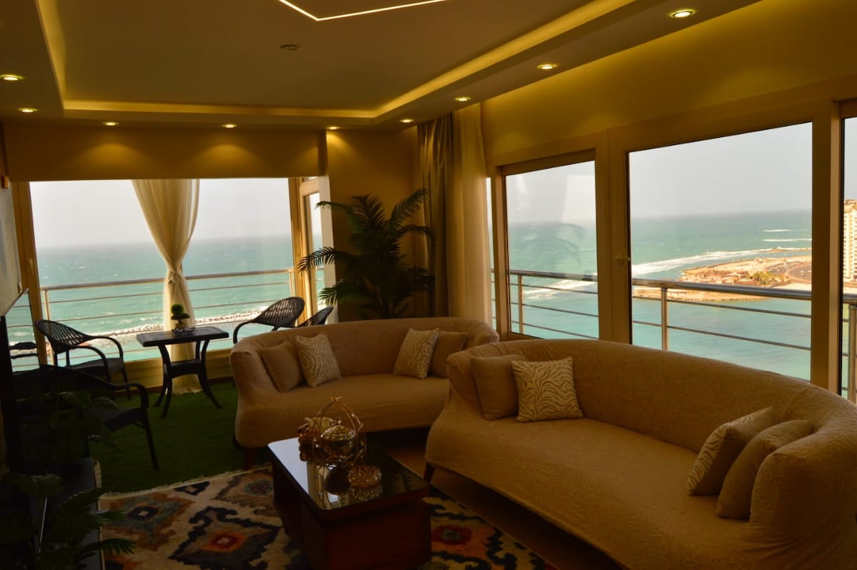 Your Luxurious Renovated 18th-Floor Mediterranean Getaway in Alexandria! 🌊🏖️ Imagine waking up to panoramic sea views from every corner of your apartment – even from your bed! Designed to maximize your sea experience, this spacious apartment is perfect for families. 3 Air condition bedrooms, each with two 120 cm beds. dining, Reception and living room offers breathtaking sea views to the west, North and East, perfect for enjoying the fresh, cool breeze, and ideal for soaking in the warm sun