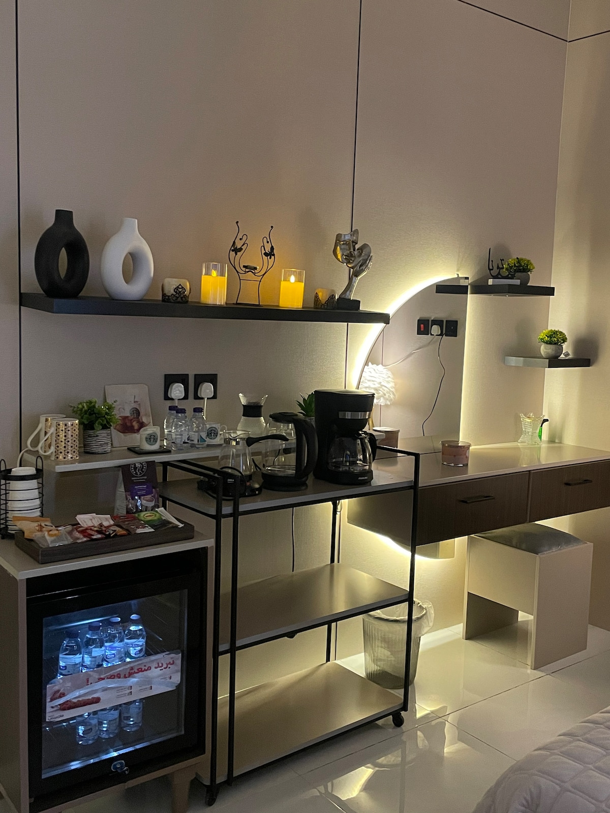 تمتع بالإقامة في شقة بمدخل خاص ودخول ذكي ومكونة من غرفتين نوم وصالة حديثة التصميم ودورة المياة بكامل ملحقاتها من شامبو وشاور جل ومناشف وصابون ومزودة بمطبخ كامل مجهز بفرن وماكرويف وثلاجة والة قهوة وغلاية وبالاضافة الى الضيافة مجانية يضعك موقعنا المتميز في قلب الحدث مع سهولة الوصول افضل المطاعم والمتاجر والاماكن السياحية