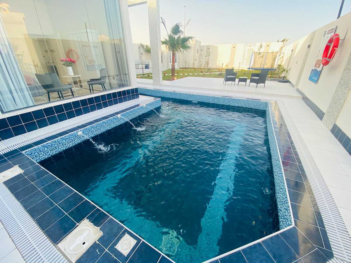 The Royal Resort Chalet is distinguished by its luxurious and hotel design, and its proximity to the Half Moon Beach (Halfmoon). The chalet also features a sophisticated indoor swimming pool with heating system overlooking the garden and the main hall lobby. It also includes a swimming pool with a heating system to provide recreation, relaxation and luxury for our dear guests. In addition, the chalet has 3 bedrooms overlooking the garden and the main hall lobby of the chalet.