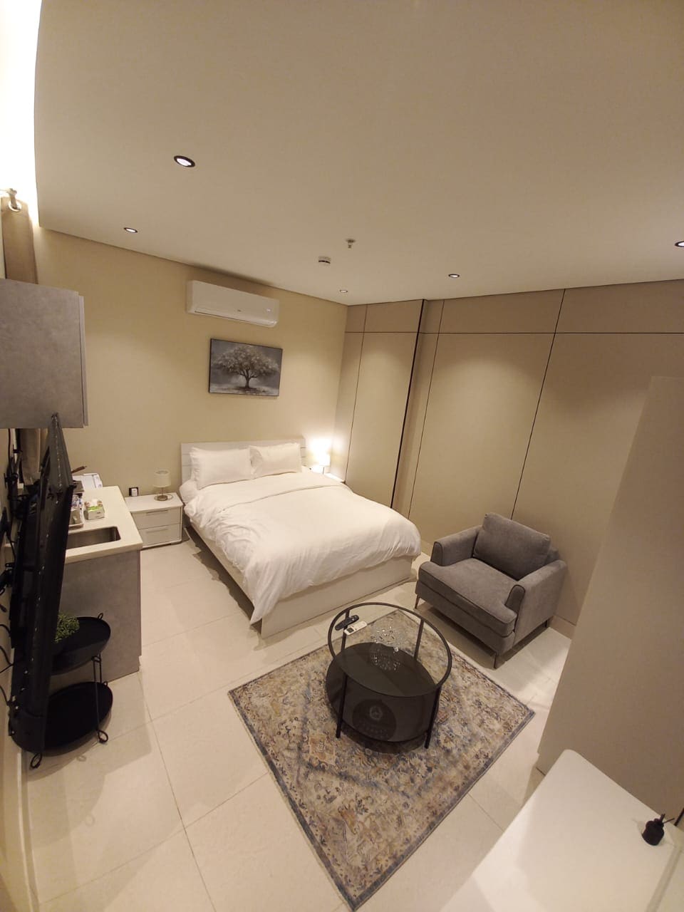 استديو بمدخل مستقل بسرير ماستر بشاشة نظام LG ماجيك ريموت ماوس بمقاس 65 مع ريموت إضافي وركن ثلاجة معبأة بالمياه وغلاية متنوعة من الشاي والقهوة ومايكروويف ودورة مياه ساندويتش وغسالة وكواية وأستشوار