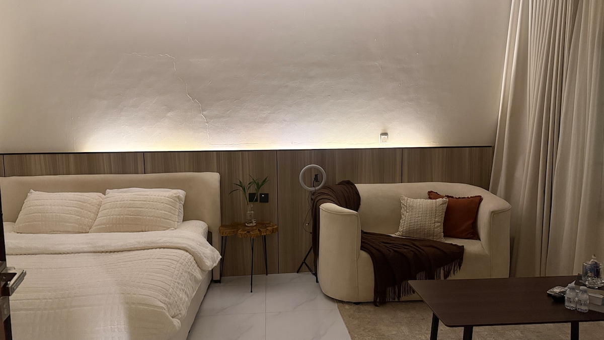 اكتشف إقامة استثنائية في استوديو أنيق صُمم ليمنحك مزيجًا مثاليًا من الراحة والخصوصية. استمتع بنوم هادئ على سرير كينج فاخر، واسترخِ على كنب مريح في أجواء هادئة ودافئة. استمتع بتجربة مشاهدة مميزة على شاشة 65 بوصة مع إنترنت مجاني سريع لتبقى متصلاً طوال الوقت. ولحظات الاسترخاء، استمتع ببانيو واسع وجميل يمنحك تجربة استحمام فاخرة بعد يوم طويل. المكان مثالي للأزواج أو للمسافرين الباحثين عن إقامة أنيقة ومريحة وتجربة لا تُنسى. ✨🛁�