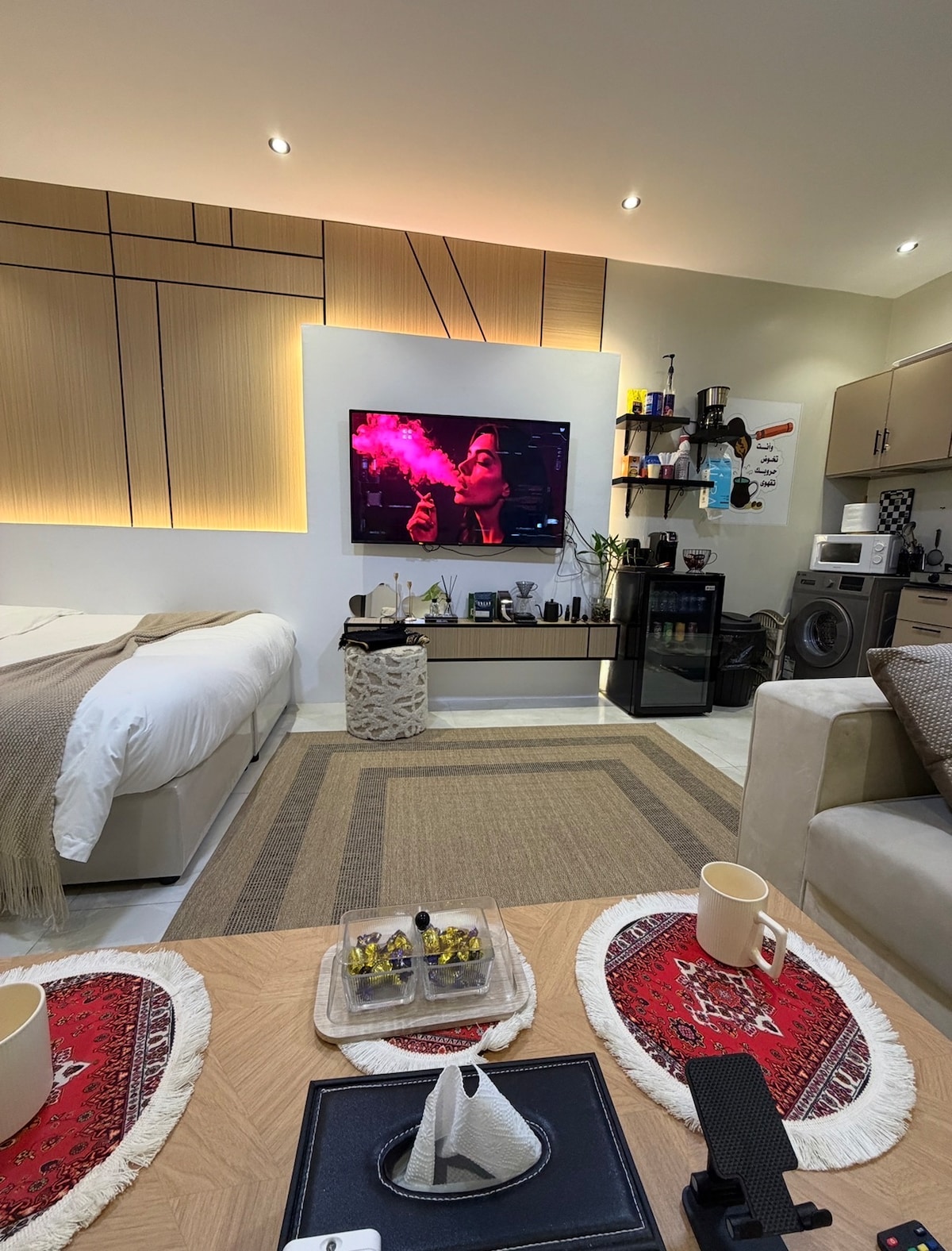 نوفر لك إقامة فريدة وراقية يتم فيها توفير جميع وسائل الراحة التي تستحقها، ونقوم هنا بتوفير وسائل الترفية من اشتراكات Netflix وShahid ، كما تحصل هنا على الخصوصية التامة وتسجيل الدخول الذاتي، في موقع مميز وقريب من جميع الاماكن السياحية والخدمية.