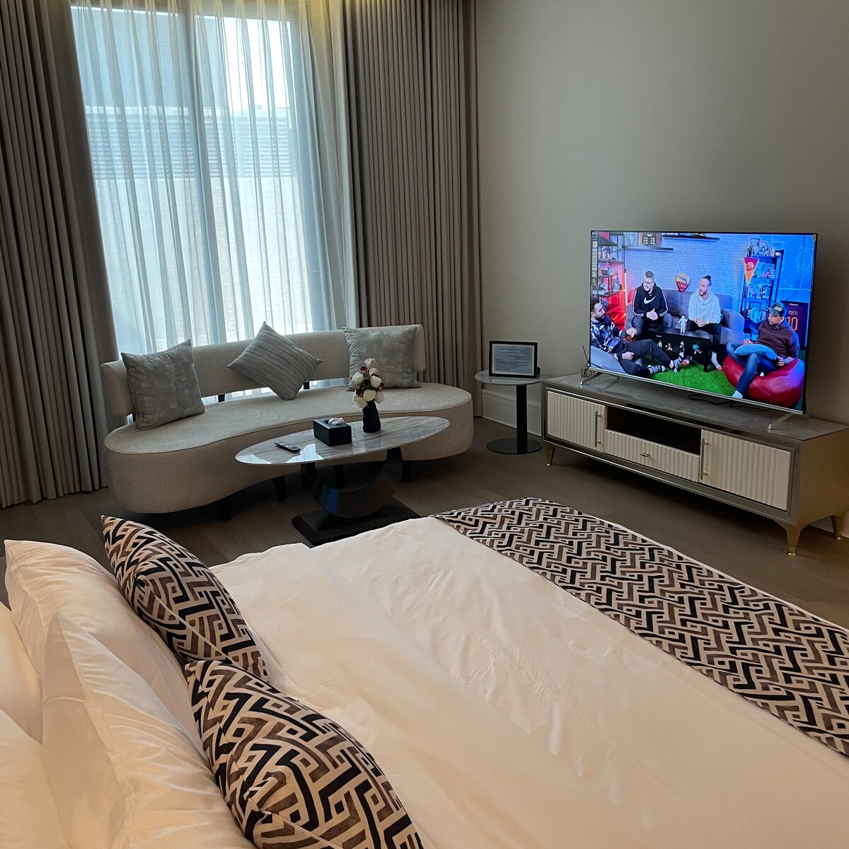 A residential studio with a high level of design and finishing, combining modern comfort and quiet luxury in an integrated space that offers a distinctive lifestyle. The room is designed in an open style, providing a sense of spaciousness, with intelligent space distribution that suits a modern lifestyle.