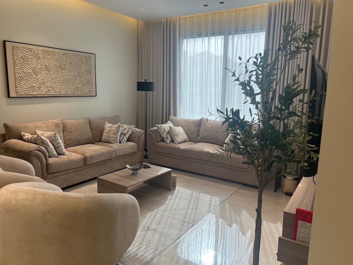 Modern Apartment for 8 Guests – 4 Bedrooms, Game Room & Hotel-Style Amenities Enjoy your stay in this spacious and comfortable apartment that accommodates up to 8 guests. It features 4 bedrooms, 4 bathrooms, a cozy living area, dining table, and a fun game room. Each guest is provided with hotel-style slippers, toothbrush & toothpaste, body wash, shampoo, and tissues. Location highlights : - 3 minutes from Azizyah Beach. -10 minutes from the King Fahd Causeway. -10 minutes from Half Moon Bay.