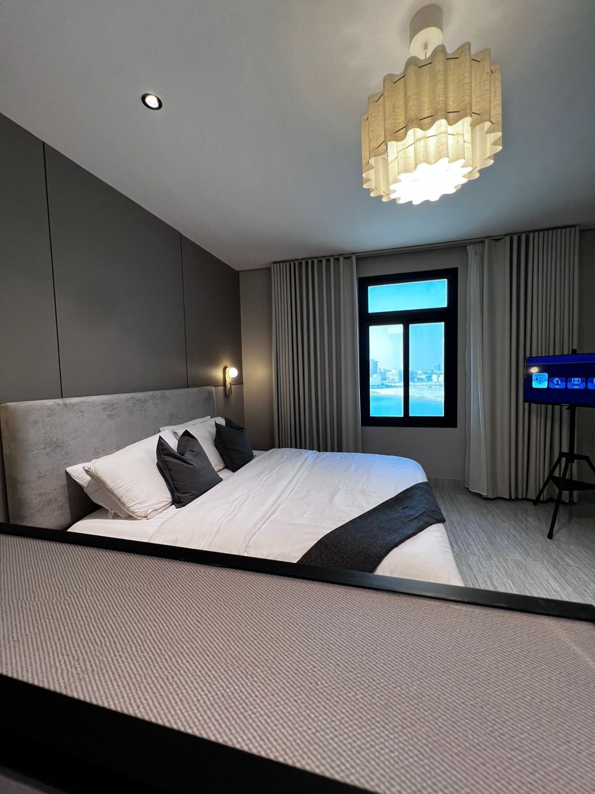 Discover a distinctive stay in a comfortable apartment in the Al Khobar city. The apartment boasts several features: 1. Smart and secure entry through a smart door lock. 2. A beautiful balcony with a View. 3. A coffee corner equipped with a coffee maker, microwave, and a small fridge. 4. A 4K smart screen. 5. Fast 5G internet connection. 1. Bahrain Bridge - within 5 minutes. 2. Rashid Mall - 10 minutes. 3. The waterfront - 5 minutes.