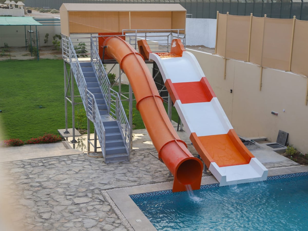 تصميم نادر من نوعه في صحراء عباره عن ملحقين ووبينهم مساحه شاسعه من العشب الاخضر ومسبح وجلسه ارضيه والعاب للاطفال وضيافه تكون جاهزه للضيف