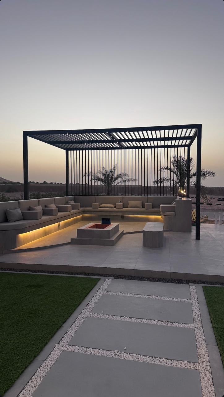 تصميم نادر من نوعه في صحراء عباره عن ملحقين ووبينهم مساحه شاسعه من العشب الاخضر ومسبح وجلسه ارضيه والعاب للاطفال وضيافه تكون جاهزه للضيف