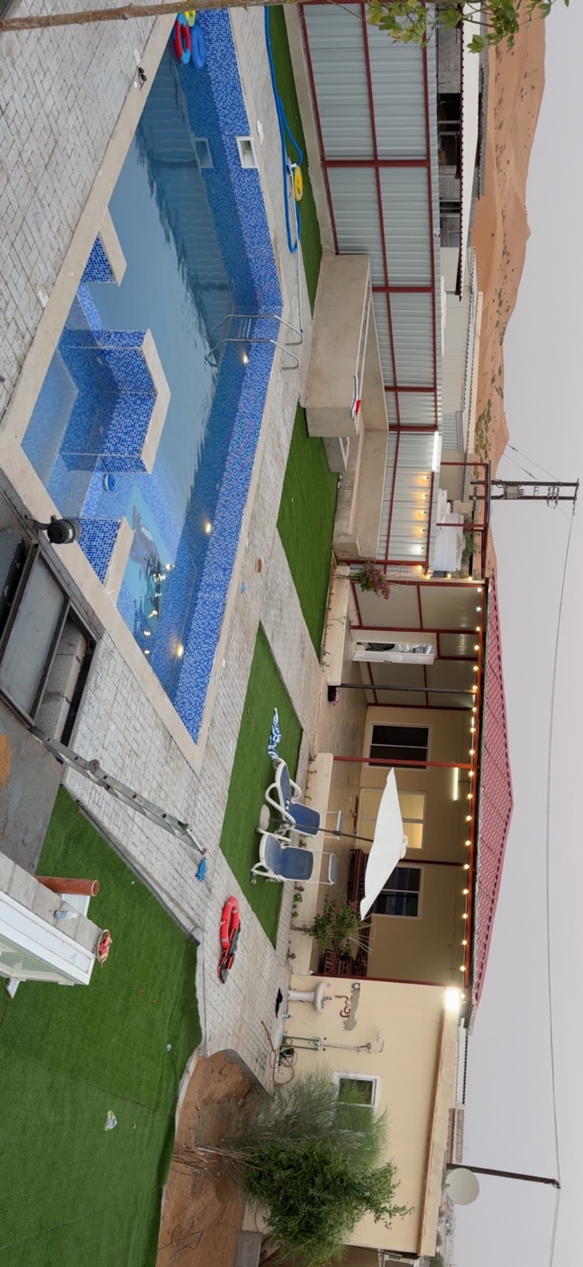 تصميم نادر من نوعه في صحراء عباره عن ملحقين ووبينهم مساحه شاسعه من العشب الاخضر ومسبح وجلسه ارضيه والعاب للاطفال وضيافه تكون جاهزه للضيف
