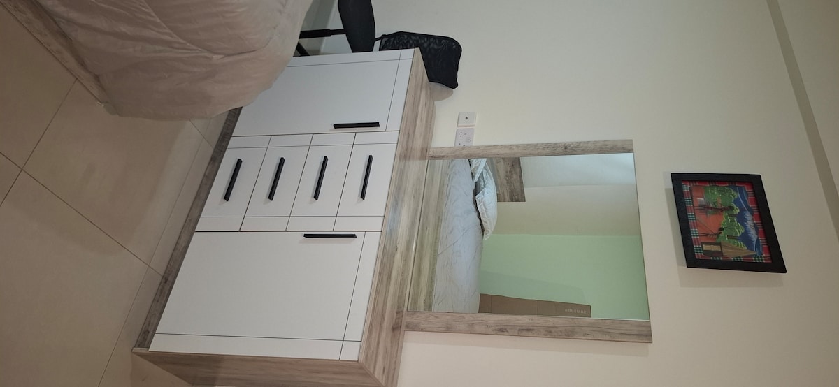 New 1 Bd flat with balcony, living area & 2 toilets.Nice furniture. Equipped with high speed WiFi, bed and dressing,sofa, 50 inch smart TV, satellite and free Netflix access, iron machine, hair dryer,vacuum cleaner, duct AC, ceiling with LED spot lights . You can enjoy the free swimming pool, gym & kids playground and BBQ cooking area. 5min drive from shopping malls, 15-20min from airport. 20min drive from beach, 20min drive from the old Market, next to sand dunes view.
