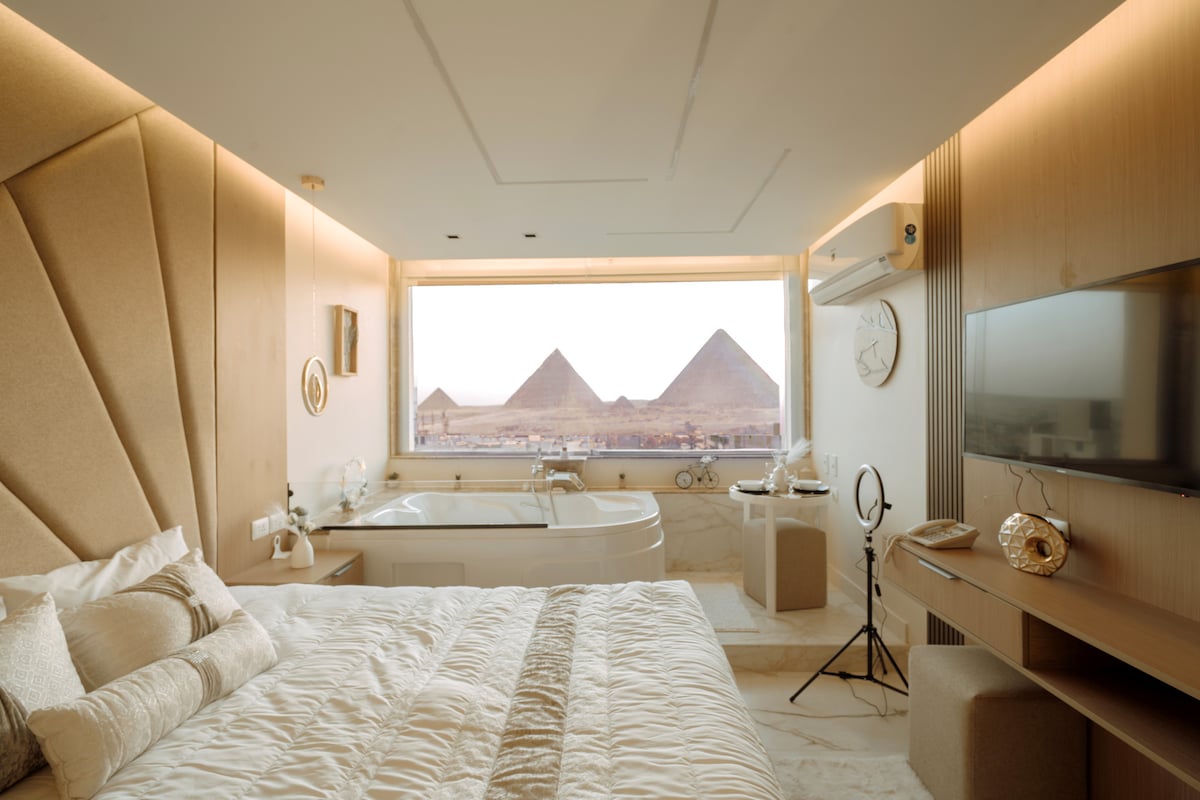 Enjoy your stay with Panoramic View of the Giza Pyramids,Sphinx Yes! view and pictures are all 100% real. (Be sure to check out our other listings too) Indulge in a stunning view of all the Giza Pyramids from anywhere within this contemporary oriental studio or while relaxing in the Jacuzzi. It is also a 10 min walk from the Pyramids entrance gate. To make the most of your trip, make sure to check out our experiences! We're committed to providing our guests the magical hospitality they deserve.