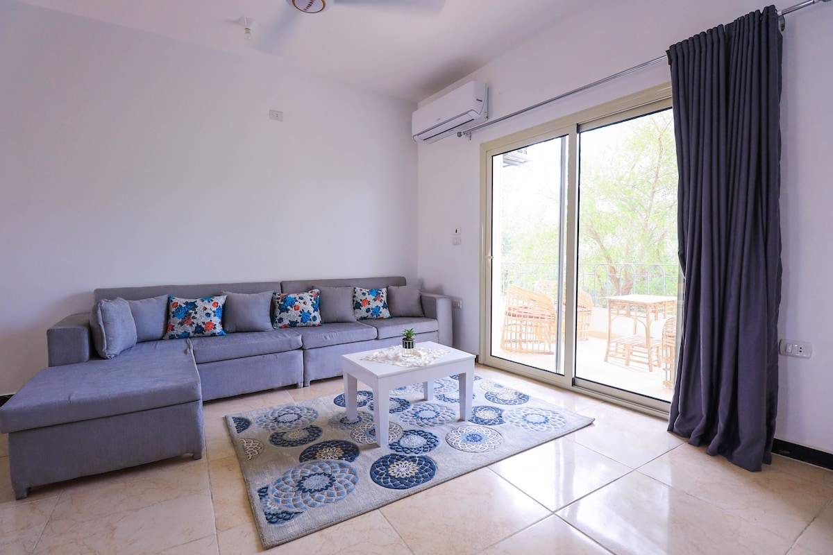 Holiday apartment in an idyllic location in Luxor. Offering a unique blend of urban living with natural beauty. Nestled right by the Nile, it's situated in a beautiful, safe residential compound away from the city's hustle and bustle. The lush greenery, serene ambiance, and lovely promenade make it a perfect retreat. Fully equipped Kitchen, 2 bathroom, Large patio windows from Lounge. Spacious terrace. Resort support guests with Concierge services if needed.