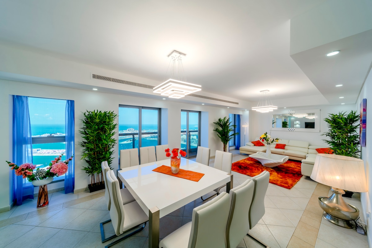 Enjoy chilling in the private pool and some sundowners overlooking the sea. This 275 square meter apartment with its private terrace is located on the 42nd floor in Jumeirah Beach Residence. The beach is a short walk away, and the area is fully of restaurants, bars and shops. It is also not far from Bluewaters Island and the Dubai Eye. It is easy to get around by foot, tram or taxi. Note that the building access operates through Face ID, and requires passport copy & digital photo of all guests.