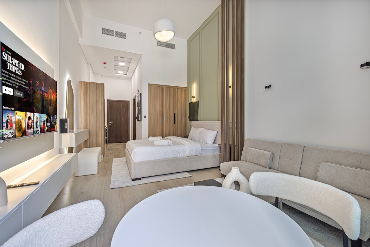 YieldStay: Stylish Studio w/ Balcony | Pool • Gym Modern studio in JVC, Dubai with a private balcony. Queen bed, smart TV, Wi-Fi, and kitchenette. Enjoy resort-style amenities: outdoor pool gym sauna 24/7 security, and on-site supermarket. Prime location near: Circle Mall Miracle Garden Global Village & Dubai Autodrome. Extras: Free parking. No pets/smoking indoor. Perfect for couples Solo travelers & business guests.