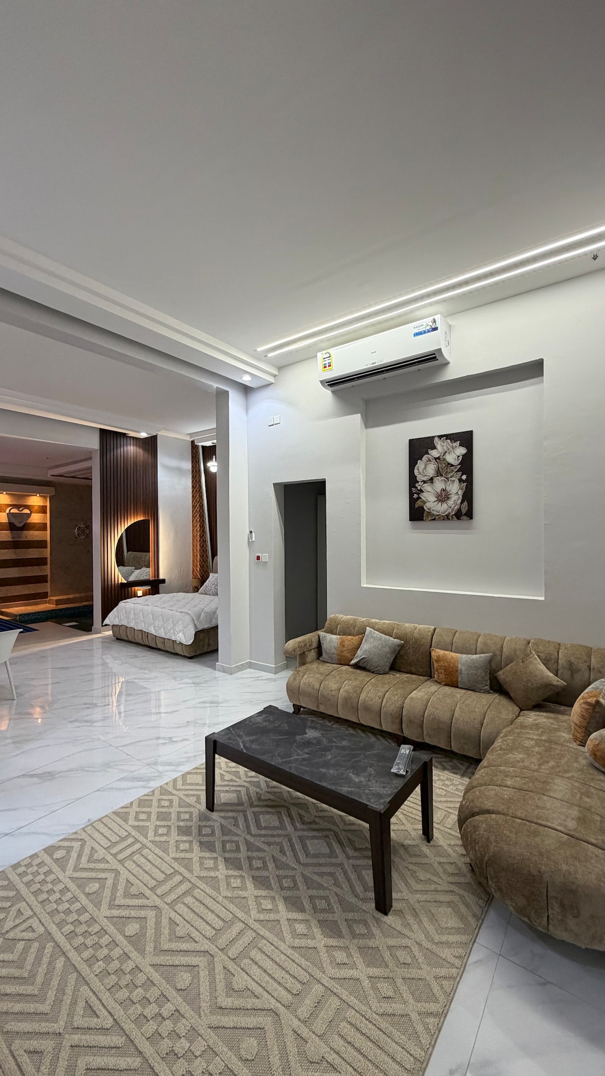استرخ في هذا المسكن الهادئ والأنيق ، بالقرب من الشاطىء على بعد دقيقتين فقط وبالقرب من مجموعة كوفيهات ومواقف ذات خصوصية تامة وتسجيل وصول تلقائي
