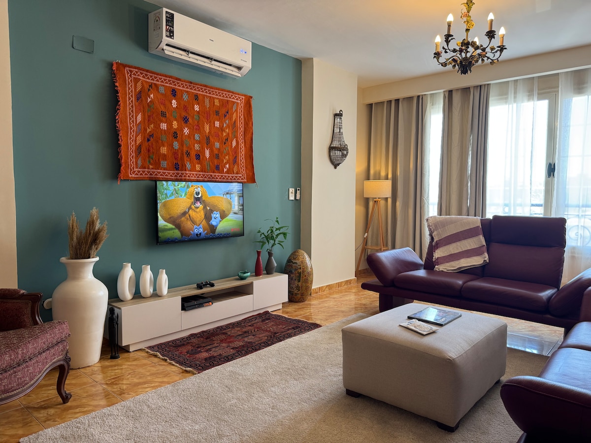 Wake up to the sight and cool breeze of the Mediterranean. This unique luxurious coastal apartment with it's boho chic laid-back style, is all about comfort. Enjoy the majestic open view of the sea &the Montaza royal gardens. Our unique spacious place has all the amenities you are looking for, restaurants and cafes are within a walking distance &affordable beach access. We are offering you our private place to enjoy during the time we are forced to leave it, hoping you like it as much as we do.