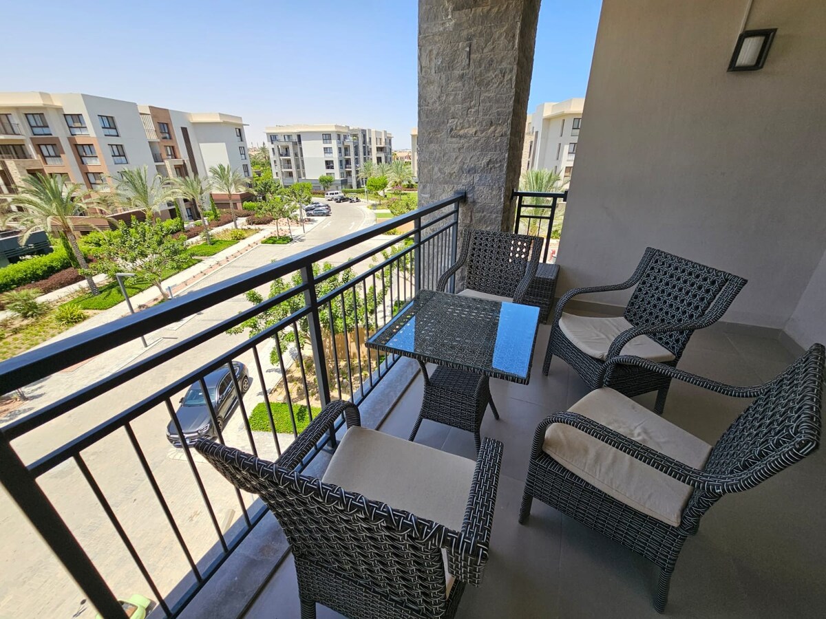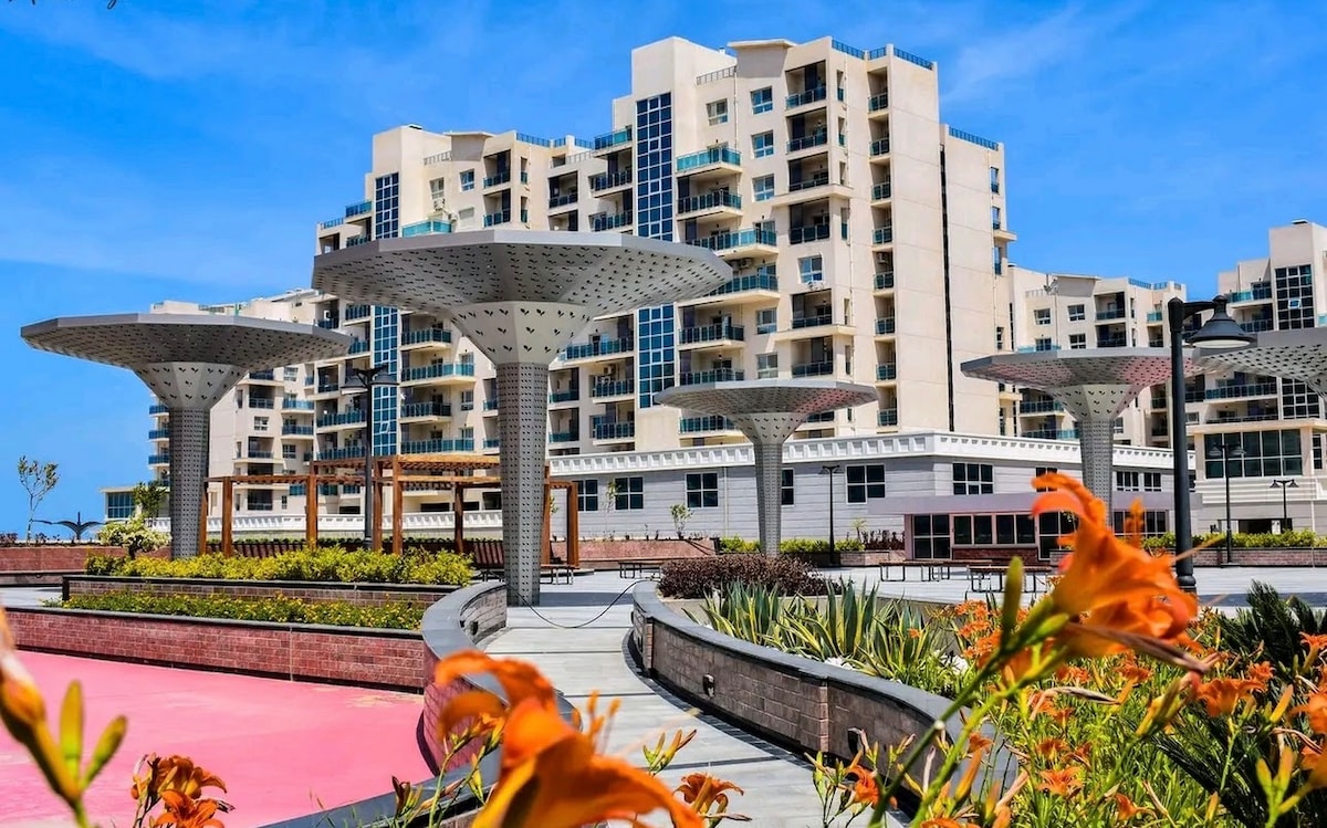 *Beach access is free for all guests Stylish spacious 2-bedroom fully conditioning apartment in a strategic location in the heart of Elalamien. You will enjoy easy access to everything; swimming pool, beach, kids area, and others. The location is vibrant and centrally located near the biggest recreational area that all famous singers and actors do all their parties & events and 3 -4 minutes to Alamien tallest towers and Marina Gate 7. The chalet is spacious and can accommodate up to 10 guests