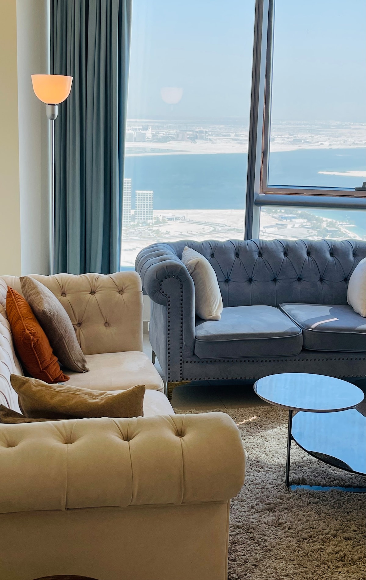 Less than a 1 minute walk from sandy shores, you will enjoy stunning unobstructed views of the mangroves day and night. Located in Al Reem Island, it is far away from the busy city yet close enough to Abu Dhabi’s hot spots. The home has been curated with tropical colours and décor in mind while maintaining the elegance of white linens. The home and linens are always cleaned by professionals for your utmost comfort. It has 2 bedrooms and 2.5 bathrooms and a fully equipped kitchen.