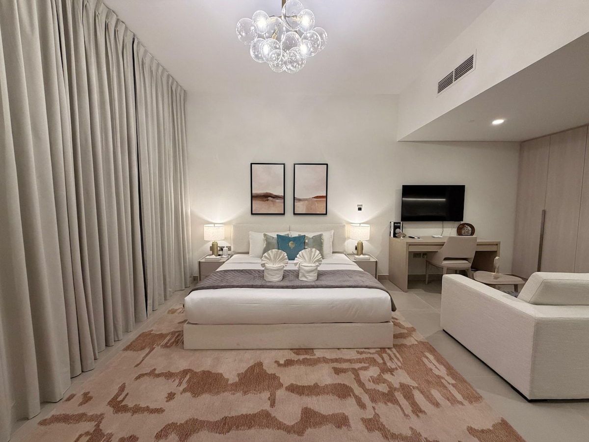 Welcome to AYLA Homes Relax in a luxurious apartment with pristine sea views! • Contemporary 103 Sqm 1-bed apartment • Queen-size bed ensuring restful nights • Elegant living room with UltraHD Smart TV and dining space • Fully stocked kitchen with Nespresso machine and all cooking essentials • Spacious en-suite bathroom plus a guest restroom • High-speed Wi-Fi included • Mall located just downstairs (40+ shops) • World class amenities • One complimentary parking space included