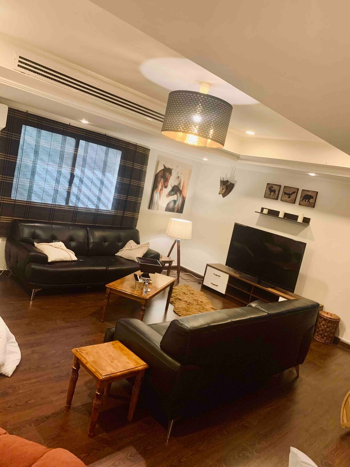 A luxury apartment next to Riyadh Season Boulevard, Hometel Residence building With a private external entrance and self-entry, consists -A living area with a billiard table, aesthetic natural plantings, a smart TV screen, a dining hall, a kitchen, and a guest bathroom, Outdoor session -kitchen (oven/ refrigerator/ microwave/ coffee maker/ kettle/ washing machine/ kitchen tools) -Master room with separate bathroom -Two bedrooms single beds, with a shared bathroom -Boulevard is just 5-minute walk