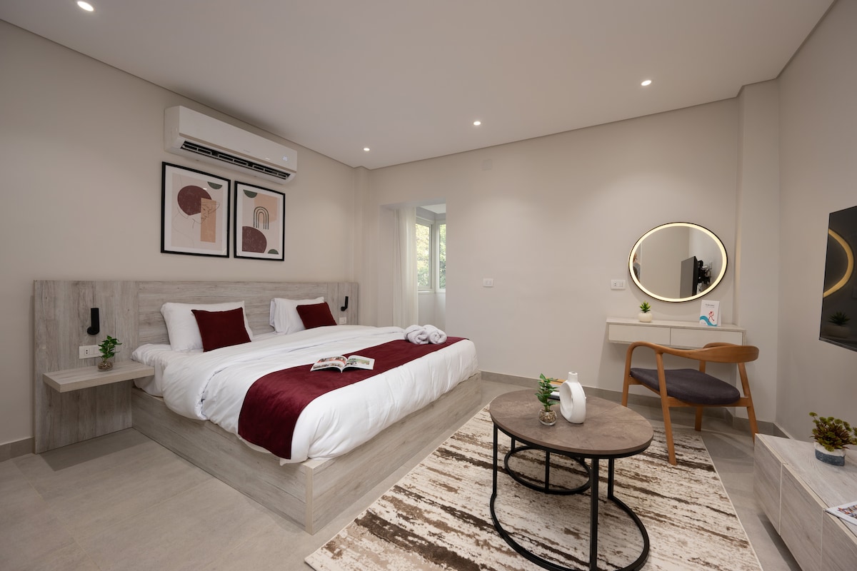 Welcome to Cherry Blossom, a cozy and stylish apartment in New Cairo’s Fifth Settlement. Enjoy rare in-room features like a personal gym corner, dedicated workspace, and a relaxing reading nook. The apartment is equipped with two high-speed fiber-optic Wi-Fi sources for uninterrupted connectivity. With a comfy queen bed, kitchenette, smart TV, and a peaceful patio, it’s perfect for business trips or quiet getaways. Just minutes from 90 Street, top malls, cafes, and all essentials.