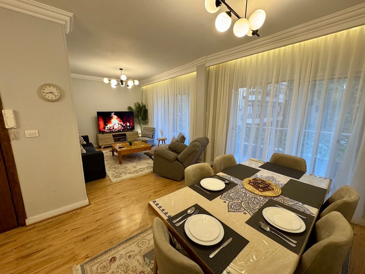 Our modern penthouse with a private pool is perfect for families seeking convenience and luxury. Located in a gated community in the upscale area of New Cairo, just 30 minutes from the airport, and close to amenities like KFC, Starbucks, and a variety of Western and local restaurants (Chili's, Fuddruckers, LongHorn Texas, Ibn Al Sham). Amenities like a King Bed, washer, dryer, dishwasher, and microwave ensure comfort, and 4 smart TVs provide entertainment.