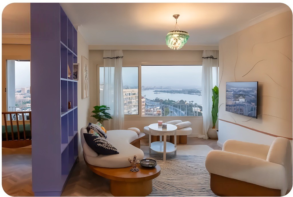 ((Kindly check our HOUSE RULES before booking)) Apartment No. "AB - N301" on the third floor. AB Duplex Studio is a unique and modern double-story unit. This unit is on the third floor with a stunning view of the Nile River and the city of Cairo. Our location will ease your stay in Cairo as we are 10 minutes from the city center and the Egyptian Museum and 30 minutes from the Great Pyramids of Giza.