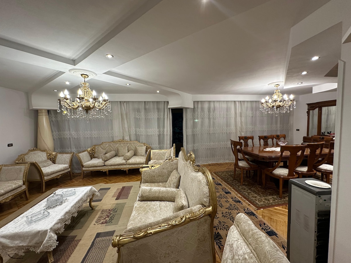 Luxurious aprtment in the cozy neighborhood of Nasr city, 5 mins to City Stars mall, 10 mins to Almaza city center mall and 20 mins to the airport. The apartment is recently renovated, and fully furnished with AC units for all living spaces. 1 master bedroom with bathroom, 2 bedrooms, 2 bathrooms, living room and spacious reception The building has two elevators serving the place.