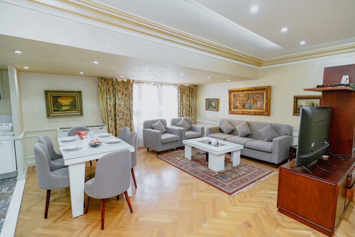 Enjoy luxury in our expansive Presidential Suite with three living areas, a grand dining table, and three bedrooms, including a master suite with a luxurious bath. Benefit from two entrances, enhanced security, and a fully equipped kitchen. Perfectly located just a 5-min walk from City Star Mall and 2-min from City Centre Mall. Includes high-speed Wi-Fi, personalized check-in, and access to an outdoor pool. Ideal for relaxation and entertainment, with an extra bed available on request.