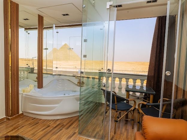 deluxe double room with Pyramids view from bed . private bathroom, bathtub, hair dryer, hot water, mirror, shampoo, shower Cap, toilet paper ,towels. rooftop with charming Pyramids view, breakfast at rooftop 24h reception , elevator . ac ,tv, mini bar, tele , safe box, kettle, sound proof window, comfortable beds ,modern furniture. ten minutes walk to Giza Pyramids, near restaurants and shops ,ATM Machines ,easy access to any part of Giza and Cairo.