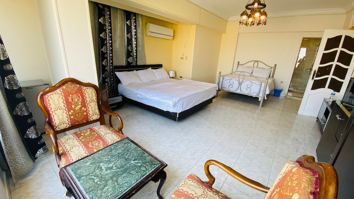 Enjoy a wonderful travel experience in this residence. Experience a blend of luxury and history in our elegant studio, located steps from the famous Pyramids of Giza, the Great Sphinx, and the Grand Egyptian Museum. Whether you're a history buff or looking for a picturesque retreat, this wonderful space offers the perfect stay for unforgettable moments. The elegant interior features luxurious furnishings, rich fabrics, and modern amenities. Relax in an atmosphere of peace and tranquility.