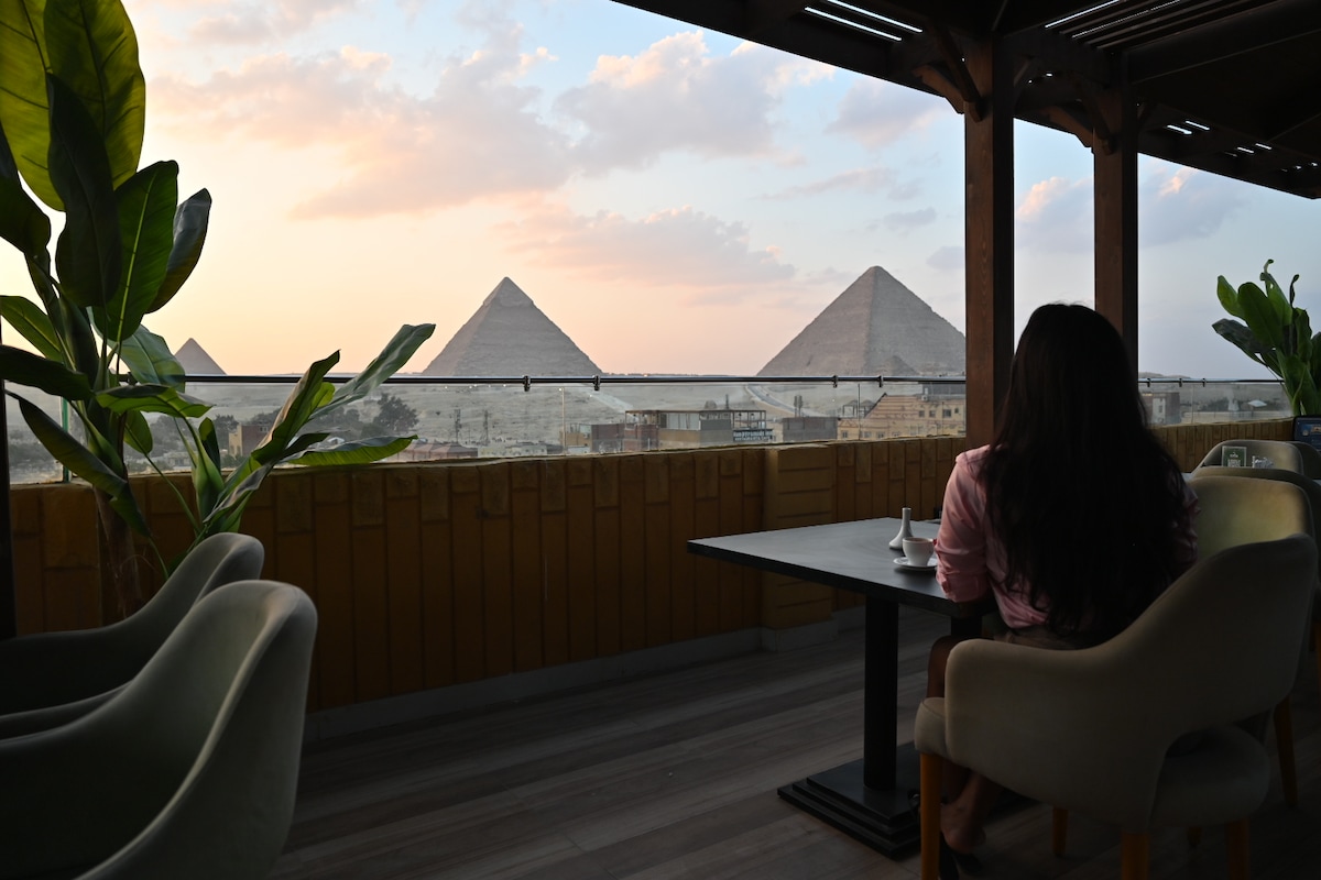 1 minute away from pyramids entrance and ticket office apartment surrounded by restaurants cafes bank. The apartment has access to another front building rooftop and hotel service like housekeeping service and free laundry .. 2 fridge 2 tv 2 air-condition tv Corner kitchenette and free unlimited high speed WiFi private entrance