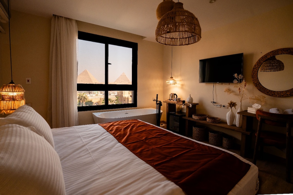 A romantic suite facing the Great Pyramids, featuring a master bedroom with private restroom, a freestanding tub with panoramic views, a spacious living area, and a full kitchen open to a dining space. Enjoy your private rooftop under the stars — perfect for couples and unforgettable honeymoon moments. The unite is minutes away from both New Grand Egyptian Museum and the new entrance (Great Gate ) of Giza pyramids complex