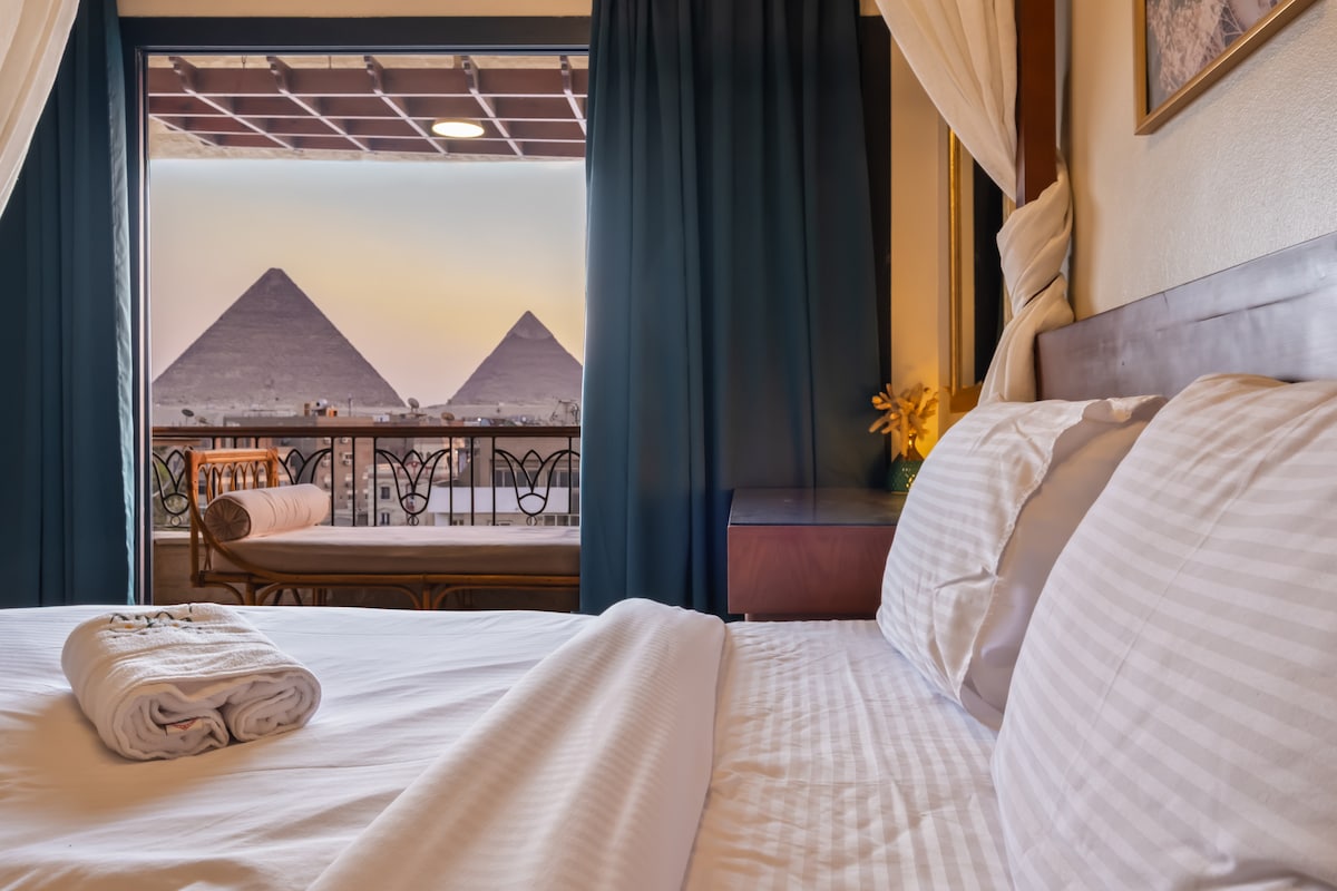 situated in Cairo with Great pyramid and sphinx reachable with in400meteres.pyramids show hotel view features concierge services.free WiFi throughout the property featuring bar the property is located within900.m of Giza pyramids the accommodation offers Room service.front desk currency exchange for guests.the room in the hotel are fitted with a seating area aflat screen tv with satellite channels.private bath room with bidet the daily breakfast offers continental.vegetariar.halal option.the a
