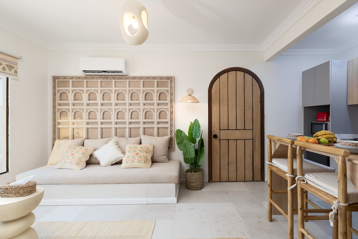 🌿 Welcome to the Pharaonic Ancient Egypt Doorway Step inside to warm wooden floors and rustic arched doors, setting a cozy, inviting tone. The living room blends modern and boho styles, with a chic TV stand with woven rattan and a lush indoor plant adding greenery. Intricate pink and beige patterned wallpaper decorates the walls, giving the space a stylish and artistic character—perfect for a relaxing stay.