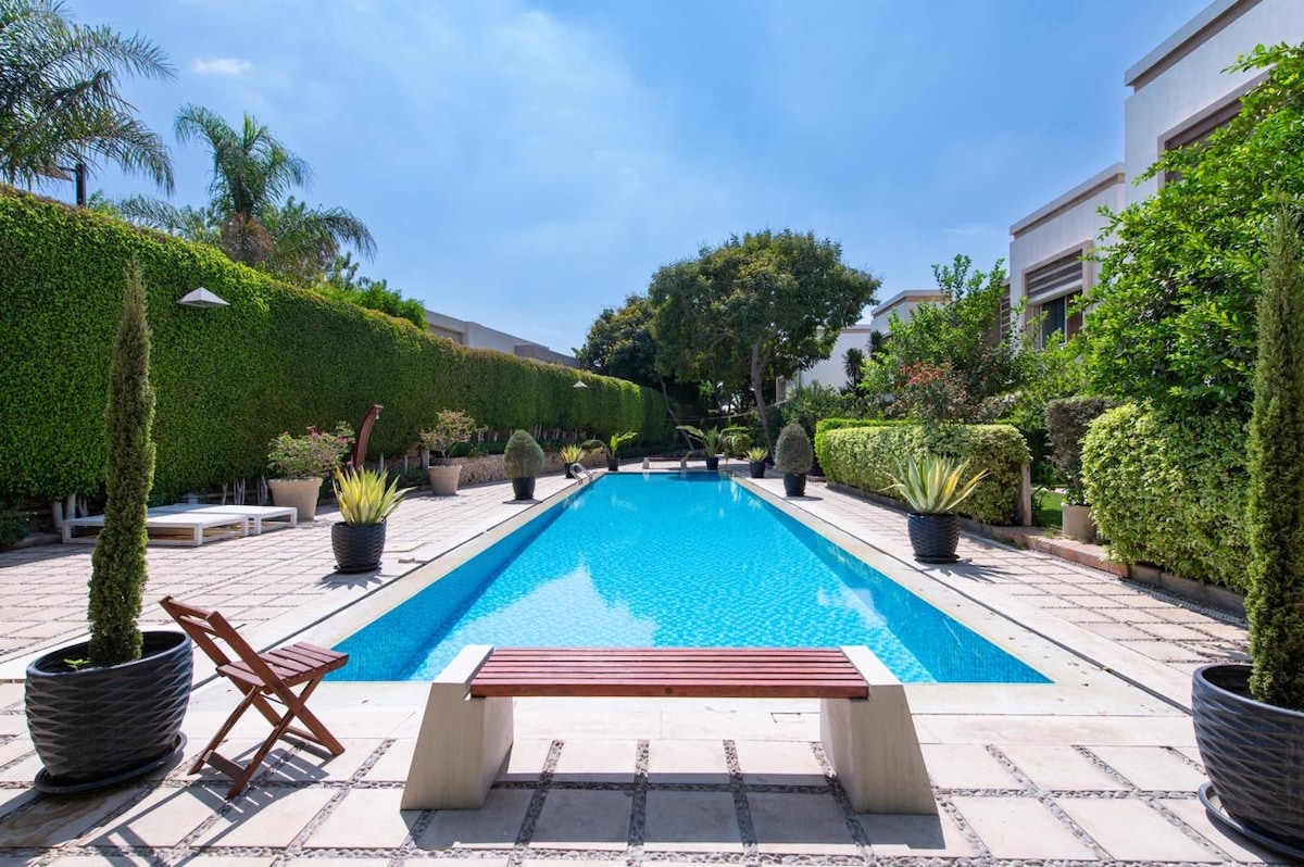 A wonderful residential villa for families and friends, with a private garden, bar, and barbecue, close to the Grand Egyptian Museum, the Pyramids entrance, and for sightseeing. You're also near the largest mall in the Middle East, Mall of Egypt.