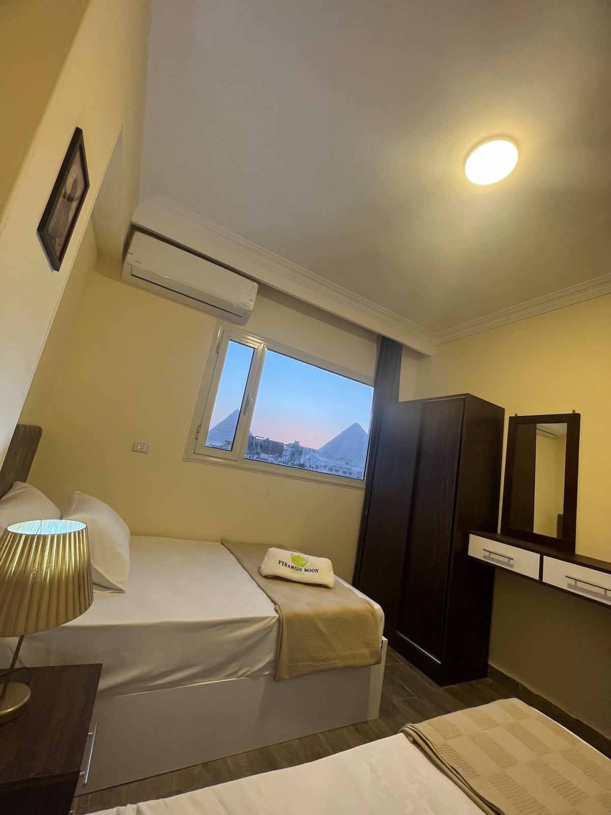 This beautiful apartment offers stunning views of the Giza Pyramids! It features 3 spacious bedrooms with large beds, 2 modern bathrooms, and a fully equipped kitchen with a washing machine. Each room has air conditioning, and there's a TV with English-language channels. The breathtaking view of the pyramids adds a unique touch to your stay. We look forward to welcoming you! For guests from Arab countries, accommodation without an official marriage contract is prohibited!